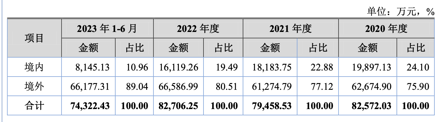 反观公司在境内市场的表现,可谓节节败退。报告期内,公司向境内第一大客户京东世纪销售金额逐年下降,从2020年的6587万元降至2023年1-6月的1944万元,到2023年上半年,京东世纪已不在公司前五大客户名单之列,境内收入更是从2020年的1.99亿元一路下滑至2023年上半年的8145万元。境内业务的持续萎缩,进一步加深了公司对境外市场的依赖,增加了经营风险。