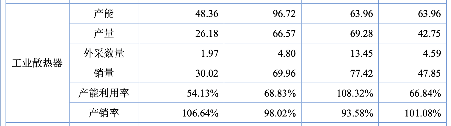 在创业板招股书中,公司表示2020年工业散热器的产量为45.21万件,销量为49.62万件;但在北交所招股书中,2020年工业散热器的产量、销量分别为42.75万件、47.85万件。